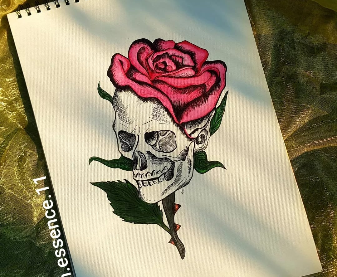 This drawing took several hours over a few days. I started with pencil — always. I find that sketching gives my thoughts space to breathe. The skull came first — carefully observing shadows and structure, because anatomy demands respect. Then came the rose, and with it, more freedom. The colors were layered slowly with ink and marker, blending in soft transitions to contrast the sharp black lines of the skull.